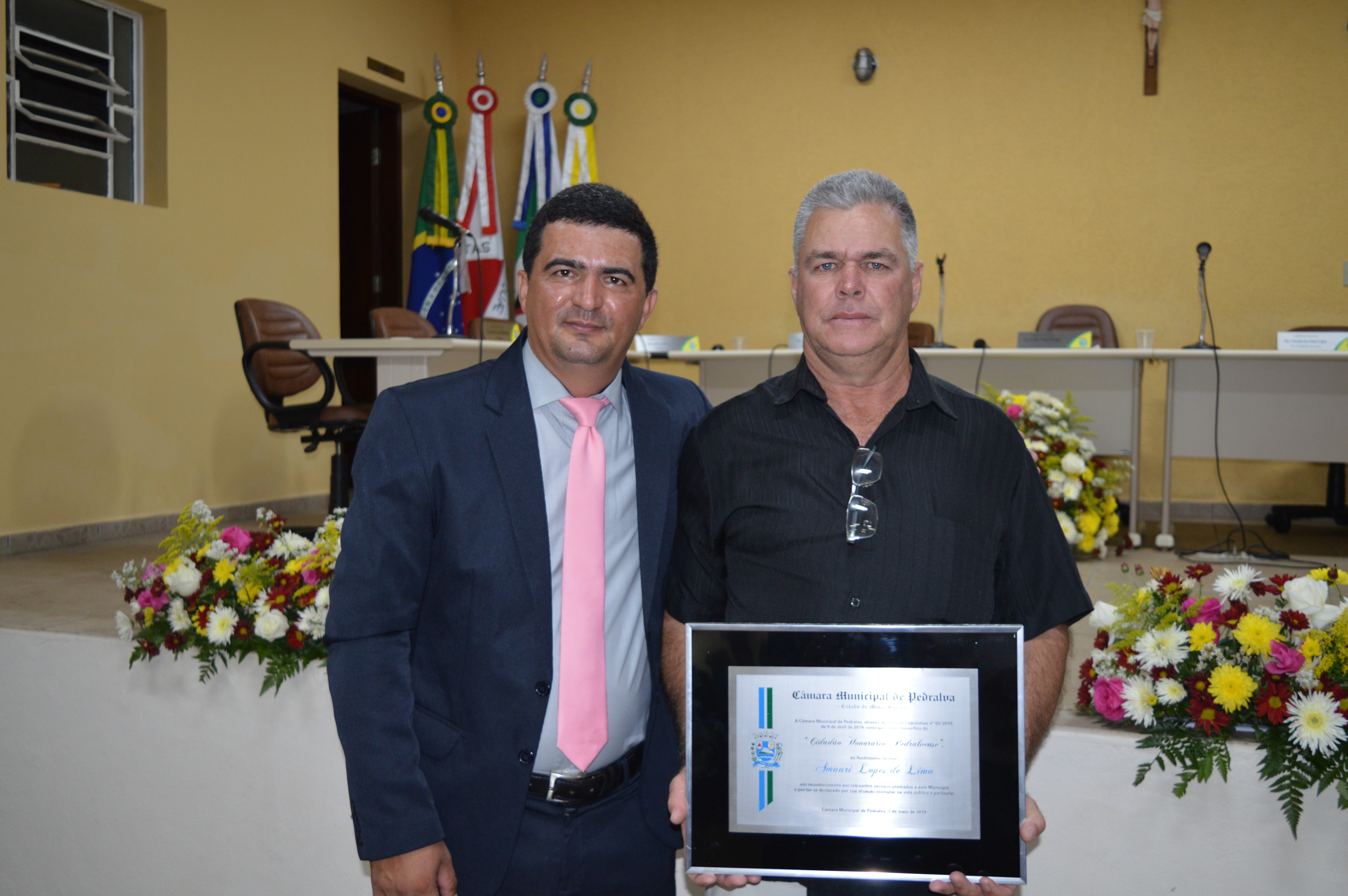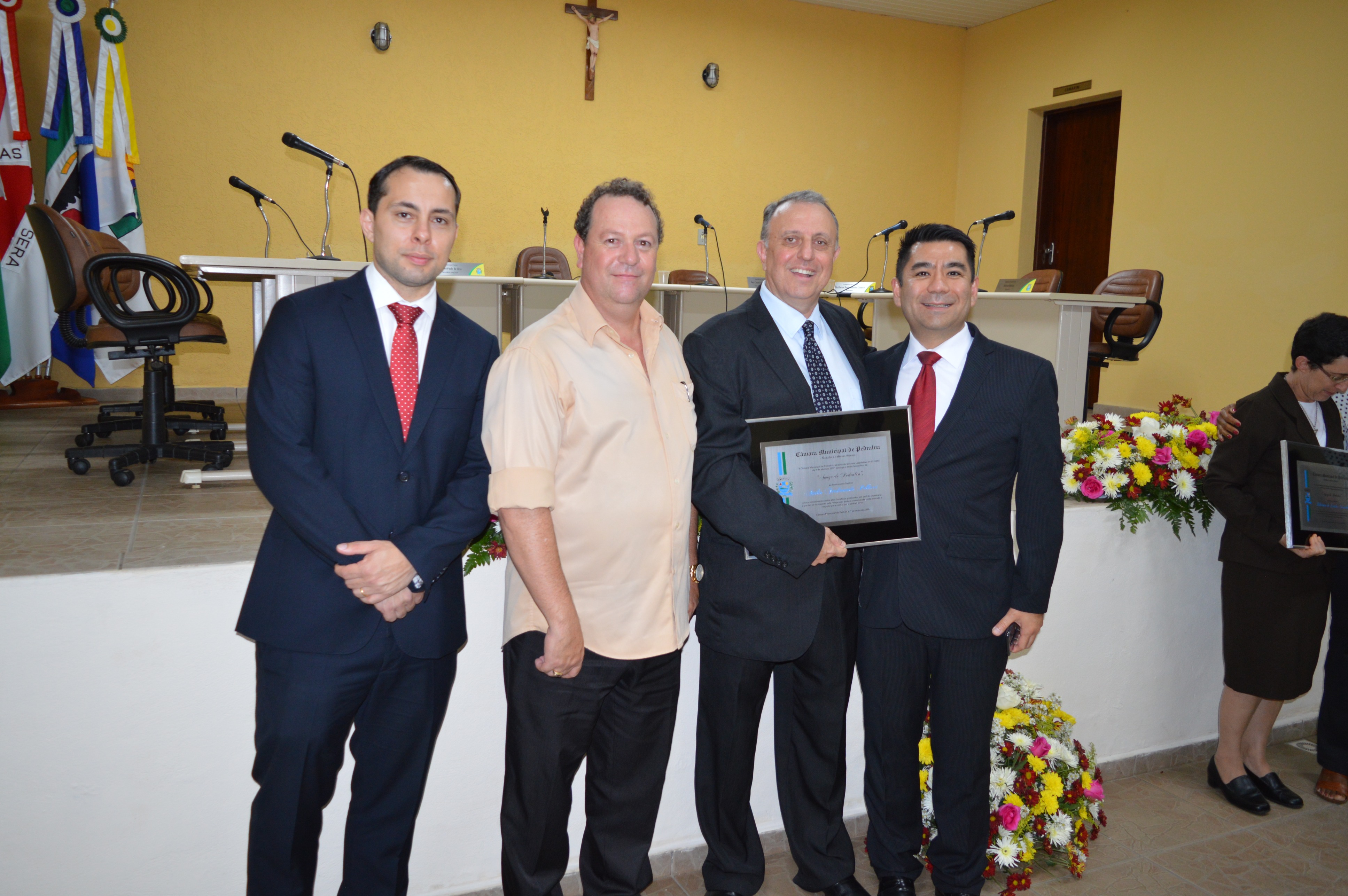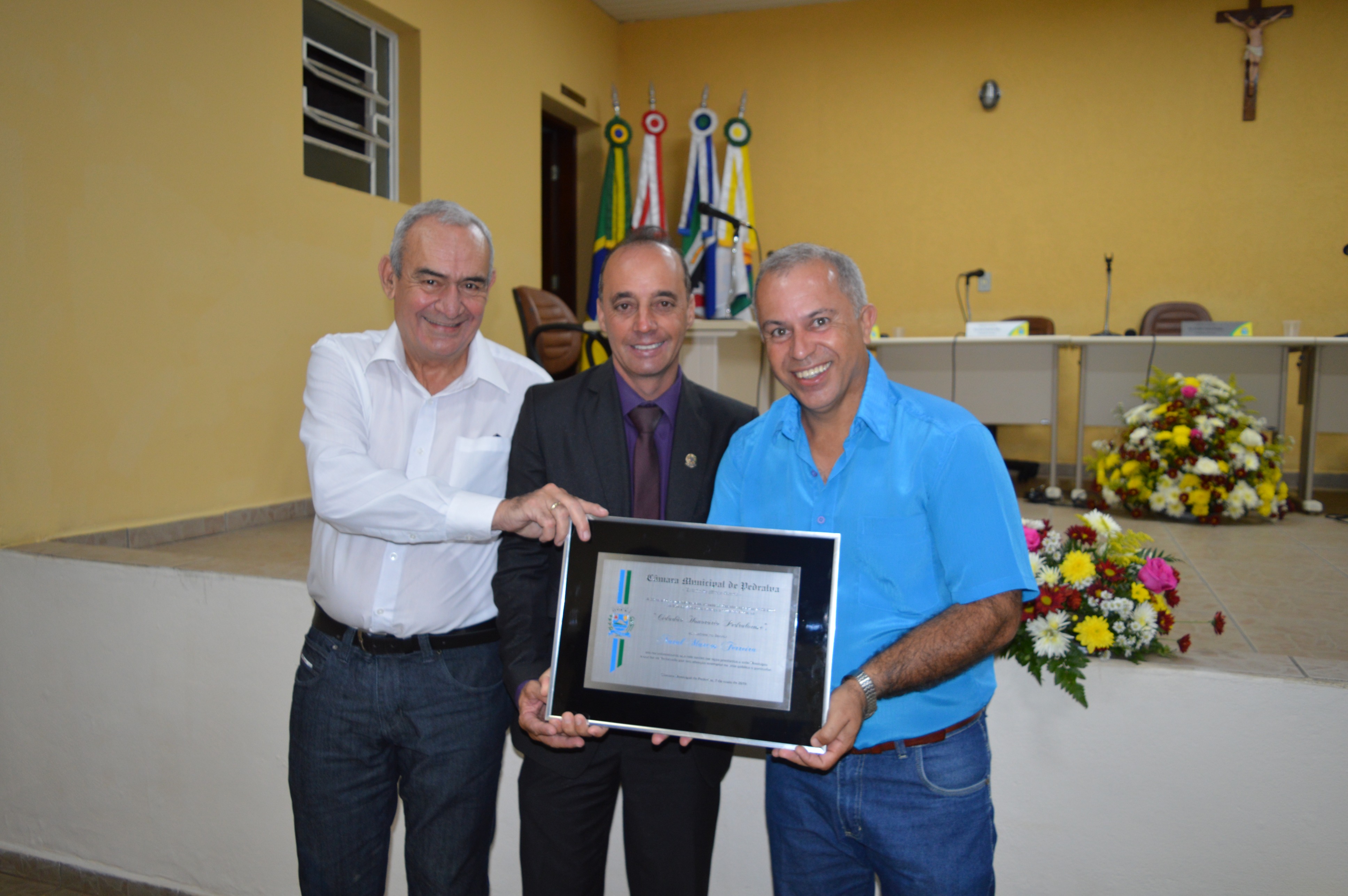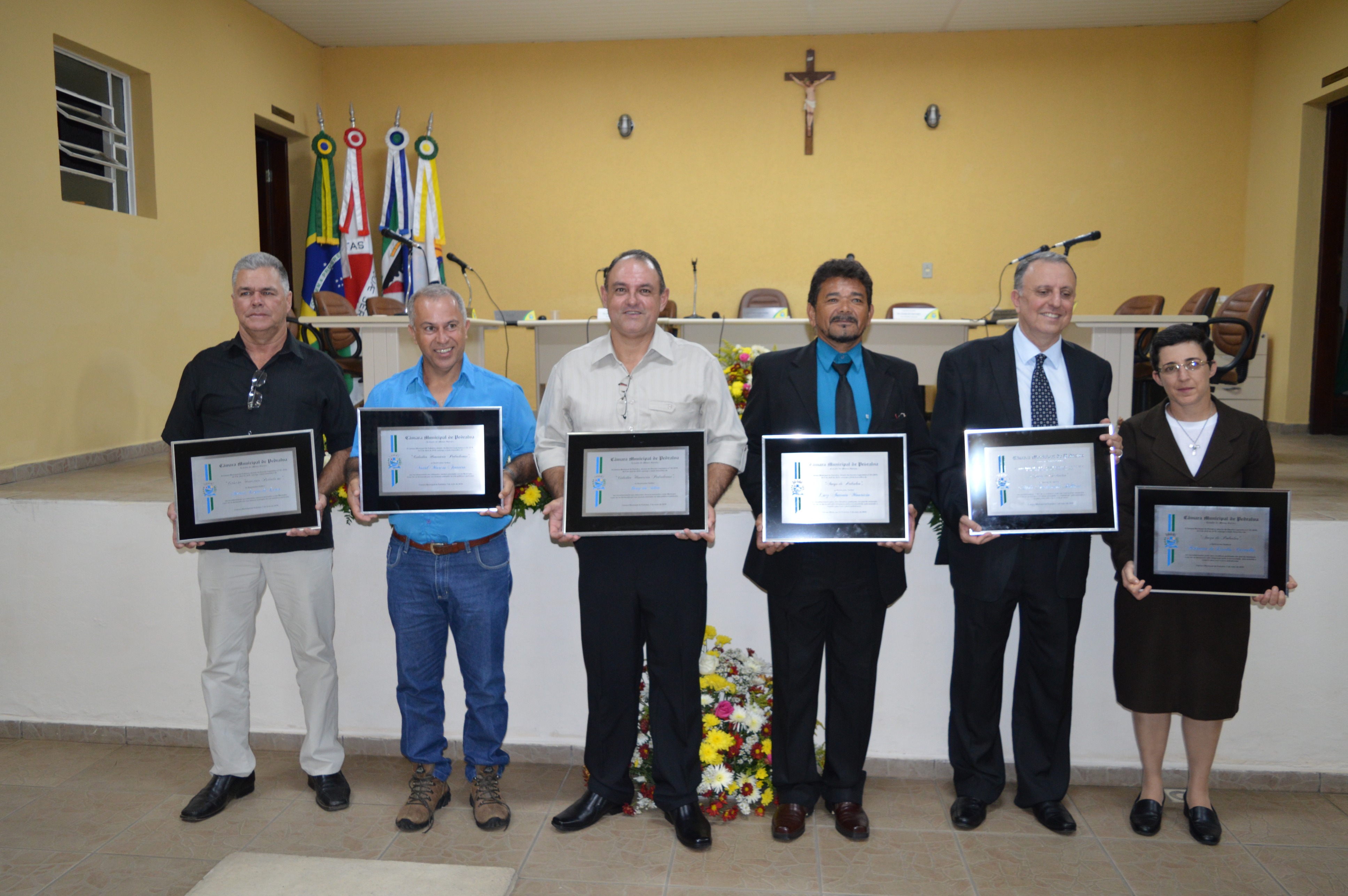 Entrega do título de Cidadão Honorário Pedralvense aos senhores Amauri Lopes de Lima, Beny da Silva e Natal Marcos Pereira; e do título de Amigo de Pedralva aos senhores Attilio Ferdinando Pellicci, Luiz Antônio Maurício e a senhora Irmã Rilvânia de Lurdes Carvalho.